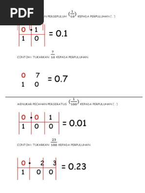 Matematik Pecahan Kepada Perpuluhan. Soalan ini yang pelbagai meliputi proses pertukaran perpuluhan kepada peratus atau sebaliknya, pecahan kepada peratus dan sebaliknya, serta pelbagai soalan lagi yang boleh disoal di dalam kertas. Cuba cara lain untuk menukar pecahan kepada perpuluhan.