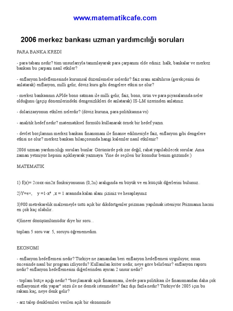 2006 Merkez Bankasi Uzman Yardimciligi Sorulari from imgv2-2-f.scribdassets.com 1) yıllık enflasyon oranının %20 olduğu bir ülkede memur maaşlarına %50 zam yapılıyor. 2 tane enflasyon sorusu var bunların çözülüşünü yazabilirseniz sevinirim. 10 mart 2015 · 15:26 · mehmet kaya tarafından soruldu.